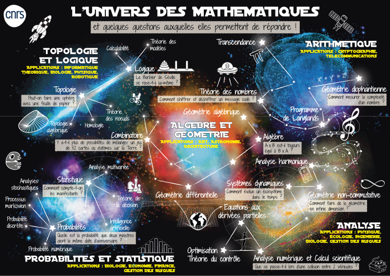 « L’Univers des mathématiques » : une carte pour représenter l’étendue de la recherche en mathématique et montrer des utilisations concrètes de la discipline (CNRS)